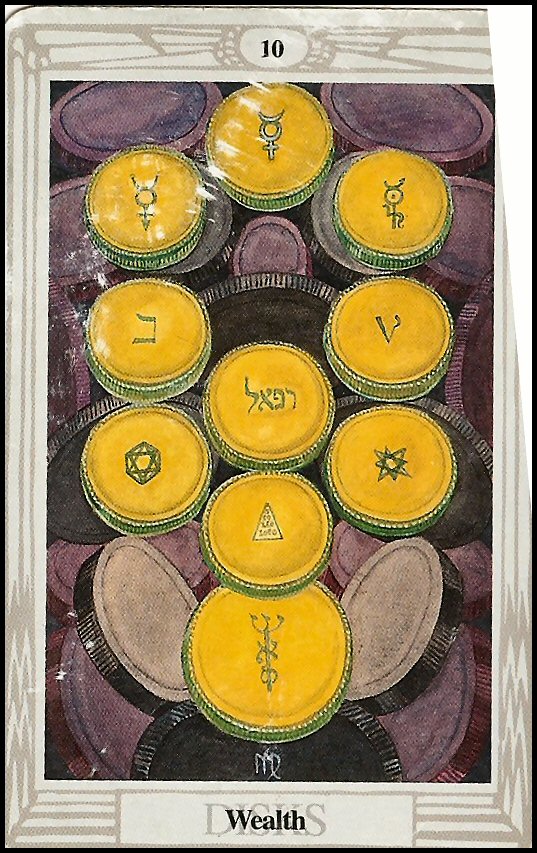 The Rider-Waite art shows an old man, with two of his descendants before him, hinting at ideas of Permanence and Establishment; his line will live on. He lives in great luxury, wears fancy clothes, and even has two dogs attending to him. He has succeeded in life. Yet at the same time, he isn’t really doing anything – he had it all, so he has nothing left to do. He is Bored. The Thoth art shows ten Disks arranged in the shape of the Tree of Life, representing completion. As the last numbered card of the final Suit, this card has a special meaning with regards to the Sefirot, as finishing the cycle – and starting it again. Behind these ten bright coins/Disks is a pile of other coins, representing having lots of wealth.